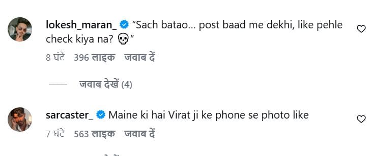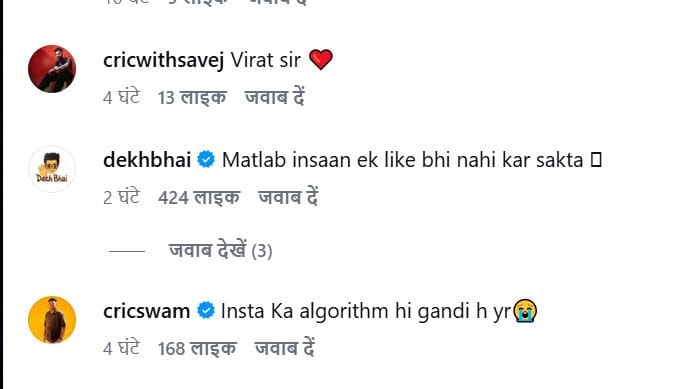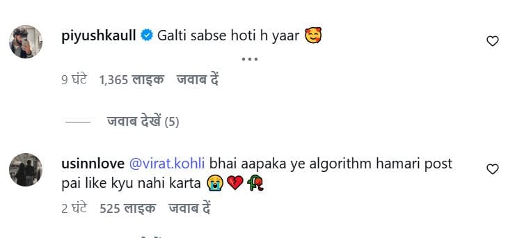 लिजलैज के इस पोस्ट पर नेटिजंस के मजेदार रिएक्शन आ रहे हैं। एक यूजर ने लिखा, 'आपका यह एल्गोरिदम कभी हमारा फोटो क्यों नहीं लाइक करता'? एक यूजर ने लिखा, 'गलती सबसे होती है'। एक यूजर ने लिखा, 'लगता है कि विराट कोहली भी लिजलैज के फैन हैं'। एक यूजर ने लिखा, 'मतलब, इंसान एक लाइक भी नहीं कर सकता है'।