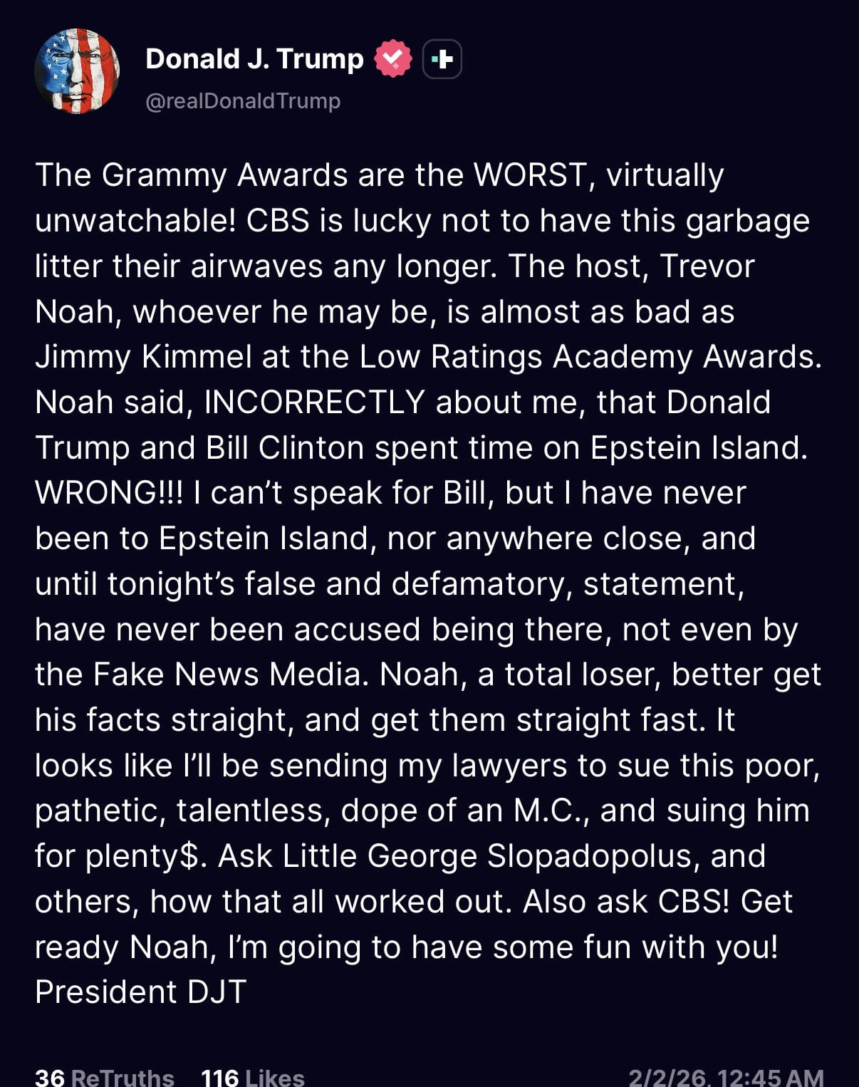 इस साल के ग्रैमी अवार्ड्स को कॉमेडियन ट्रेवर नोआ होस्ट कर रहे थे। उन्होंने इस अवॉर्ड नाइट में डोनाल्ड ट्रंप का मजाक बनाया। उन पर कुछ आपत्तिजनक बातें भी कहीं। इस बात से खफा होकर डोनाल्ड ट्रंप ने ट्रेवर नोआ को लूजर कह दिया। डोनाल्ड ट्रंप अपने एक्स अकाउंट पर एक ट्वीट करते हुए लिखते हैं, ‘ट्रेवर नोआ ने मेरे बारे में गलत कहा है। उसने कहा कि डोनाल्ड ट्रंप और बिल क्लिंटन ने एपस्टीन आईलैंड पर वक्त बिताया। यह बिल्कुल गलत है। मैं बिल के लिए नहीं बोल सकता लेकिन मैं कभी एपस्टीन आईलैंड पर नहीं गया।’