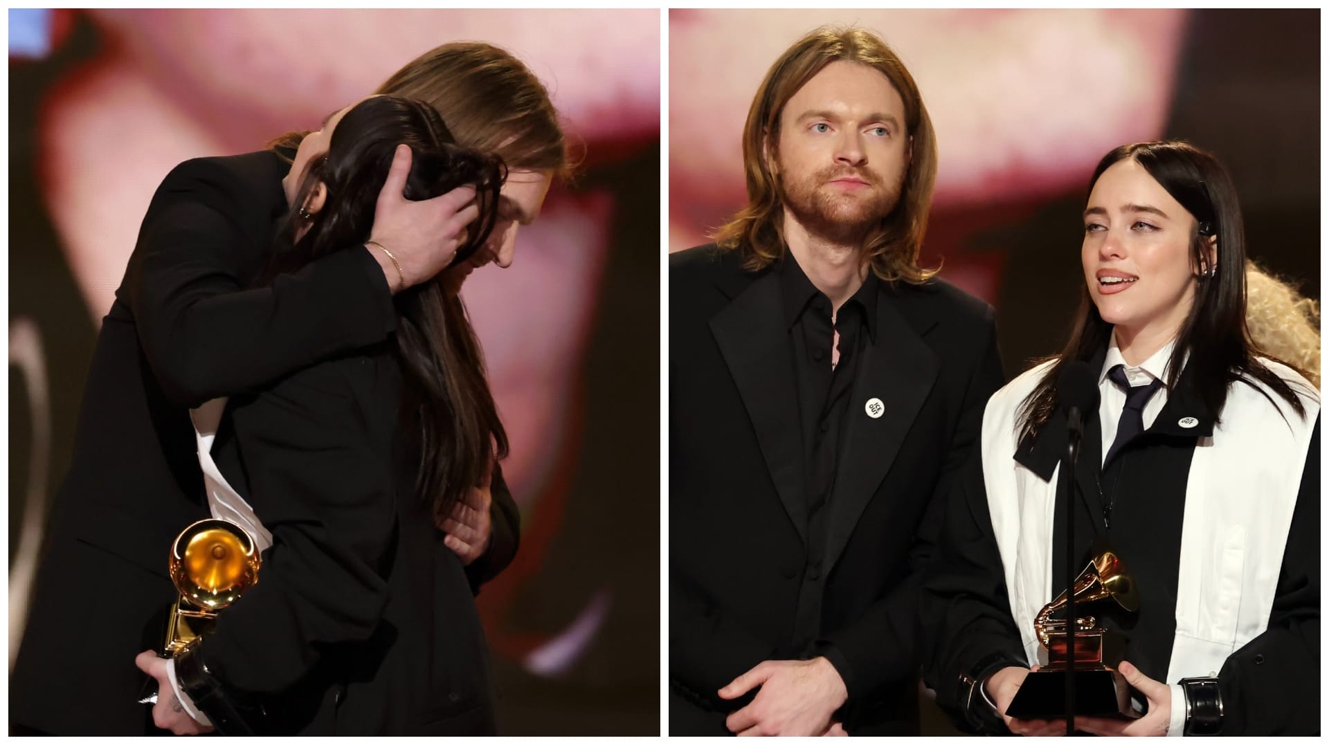 अवॉर्ड जीतने के बाद मंच पर भावुक हुईं बिली एलिश को उनके भाई ने गले लगा लिया।