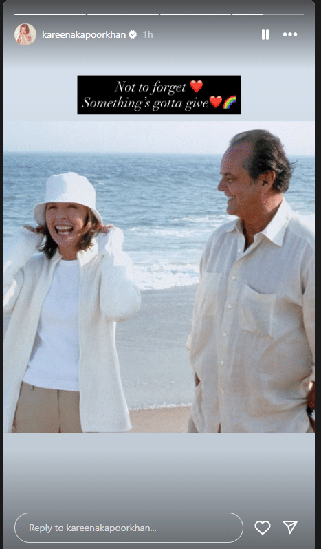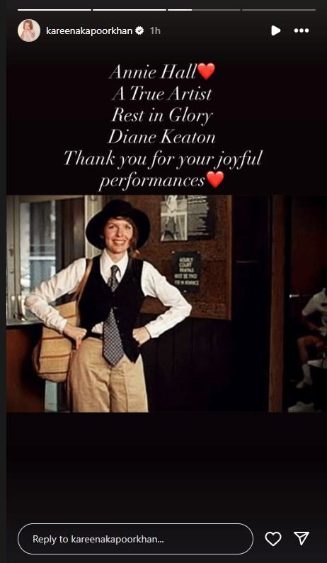 करीना ने फिल्म 'एनी हॉल' से एक तस्वीर शेयर की, जिसमें डाएन ने वुडी एलन के साथ मुख्य भूमिका निभाई। यह फिल्म एक गायक की कहानी है, जो अपने रिश्ते की असफलता को समझने की कोशिश करता है। इसे अब तक की बेहतरीन फिल्मों में गिना जाता है। इसके अलावा करीना ने 'समथिंग्स गॉट्टा गिव' की भी एक तस्वीर शेयर की है, जिसमें डाएन ने 56 साल की एक तलाकशुदा नाटककार एरिका बैरी का किरदार निभाया, जो शांत और पेशेवर जिंदगी जी रही है, लेकिन रोमांटिक रूप से निराश है।