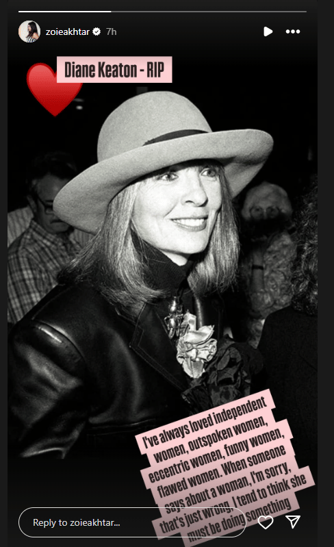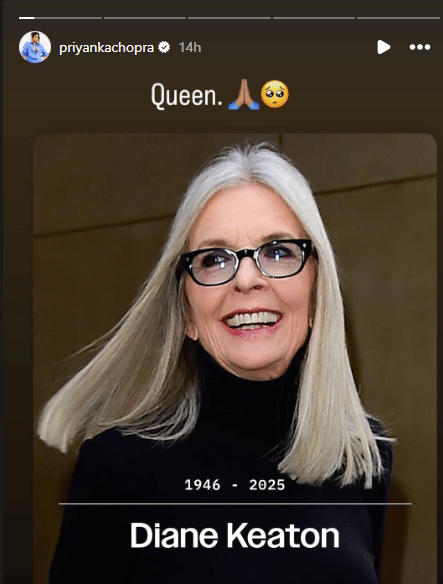 प्रियंका जोनस चोपड़ा और जोया अख्तर ने भी डाएन कीटन को श्रद्धांजलि देते हुए अपनी इंस्टाग्राम स्टोरी पर दुख जताया है। प्रियंका ने दिवंगत हॉलीवुड एक्ट्रेस डाएन कीटन की एक तस्वीर शेयर कीं और साथ ही लिखा, 'क्वीन'। वहीं निर्देशक और निर्माता जोया अख्तर ने भी अपनी इंस्टाग्राम स्टोरी पर डाएन की एक खास तस्वीर शेयर की और साथ ही लिखा, 'मुझे हमेशा से स्वतंत्र महिलाएं, बेबाक महिलाएं, सनकी महिलाएं, मजाकिया महिलाएं और खामियों वाली महिलाएं पसंद रही हैं। जब कोई किसी महिला के बारे में कुछ कहता है, तो मुझे माफ करना, वो बिलकुल गलत है। मुझे लगता है कि वो जरूर कुछ कर रही होगी... RIP'