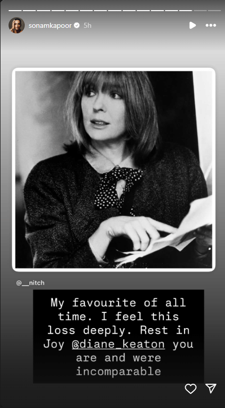 सोनम कपूर ने डाएन कीटन की फिल्मों और उनके प्रतिष्ठित इंटरव्यूज के कई क्लिप इंस्टाग्राम स्टोरी पर शेयर किए। इसके साथ सोनम ने लिखा, 'मेरी हमेशा से पसंदीदा। इस क्षति को मैं बहुत गहराई से महसूस कर रही हूं। शांति से विश्राम करें। आप अतुलनीय थीं और हैं।'