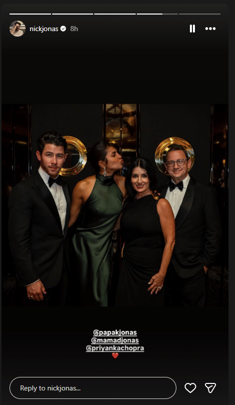 निक जोनस ने भी अपने पापा को जन्मदिन की बधाई दी। उन्होंने बचपन की एक पुरानी फोटो इंस्टाग्राम स्टोरी पर शेयर की, जिसमें छोटे निक अपने पिता के साथ नजर आ रहे हैं। इसके अलावा निक ने एक और तस्वीर शेयर की, जिसमें प्रियंका के अलावा उनके पिता भी नजर आ रहे हैं। एक और तस्वीर है, जिसमें निक के पिता और मालती साथ में नजर आ रहे हैं। निक ने इन तस्वीरों के साथ लिखा, 'दुनिया के सबसे अच्छे पापा और दादाजी को जन्मदिन की शुभकामनाएं।'
