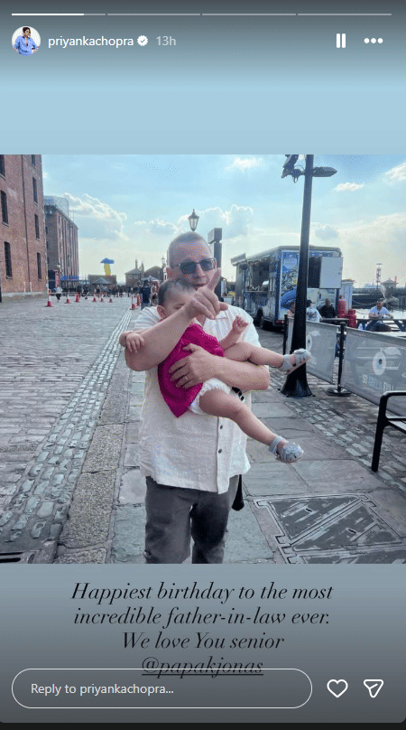 प्रियंका ने इंस्टाग्राम स्टोरी पर एक क्यूट फोटो शेयर की, जिसमें पापा जोनस अपनी पोती मालती मैरी को गोद में लिए हुए हैं और किसी चीज की ओर इशारा कर रहे हैं। प्रियंका ने लिखा, 'सबसे अद्भुत ससुर जी को जन्मदिन की बहुत-बहुत शुभकामनाएं। हम आपसे बहुत प्यार करते हैं सीनियर @papakjonas।'