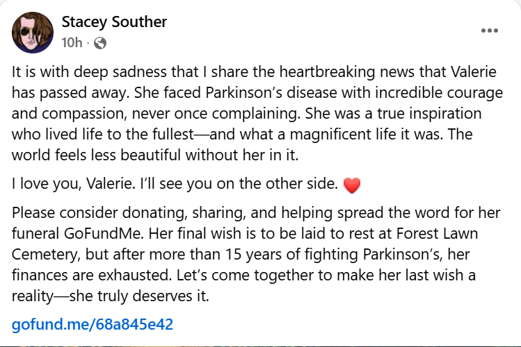 साउथर ने एक GoFundMe लिंक भी पोस्ट किया और बताया कि पेरिन की अंतिम इच्छा फॉरेस्ट लॉन कब्रिस्तान में दफन होने की थी। उन्होंने बताया कि 2015 में पार्किंसंस रोग का पता चलने के बाद से पेरिन इलाज के खर्च के चलते आर्थिक तंगी का सामना कर रही थीं।
