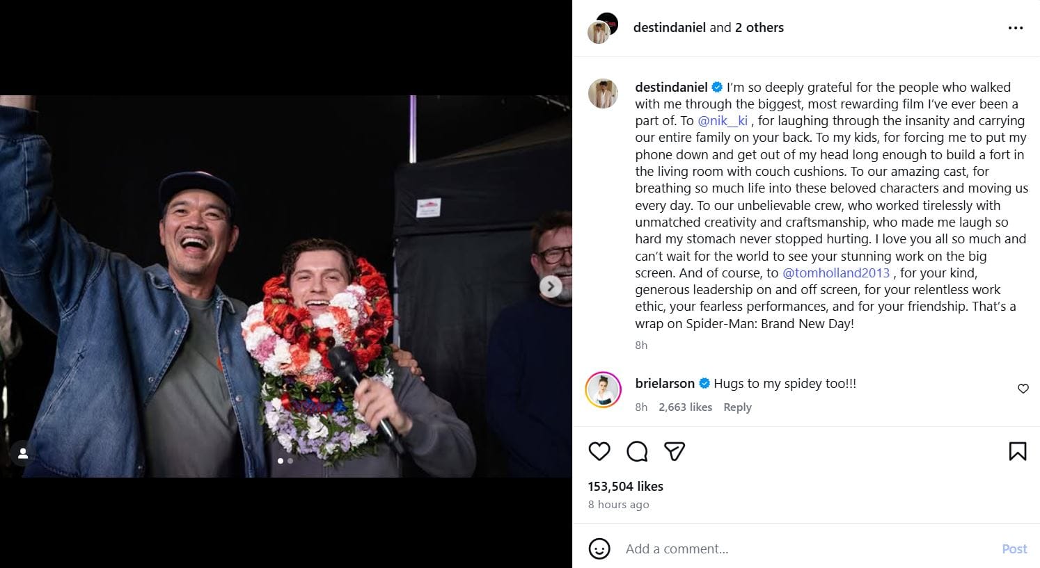 फिल्ममेकर ने टॉम हॉलैंड की तारीफ में लिखा 'मैं आपसे बहुत प्यार करता हूं और दुनिया को बड़े पर्दे पर आपका शानदार काम दिखाने के लिए उत्साहित हूं। स्क्रीन पर और स्क्रीन के बाहर आपकी दयालु, उदार लीडरशिप के लिए, आपकी लगातार काम करने की लगन, आपकी निडर परफॉर्मेंस और आपकी दोस्ती के लिए धन्यवाद। 'स्पाइडर-मैन: ब्रांड न्यू डे' की शूटिंग खत्म हो गई है।'