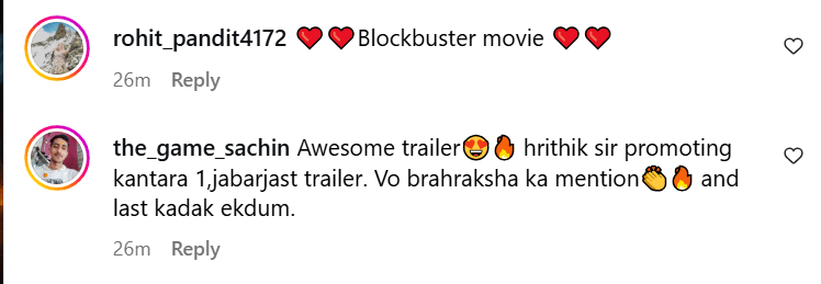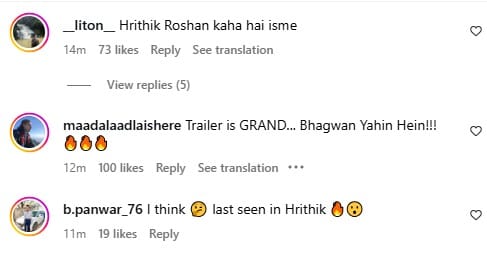कई यूजर्स ने अलग-अलग कमेंट किए हैं। एक प्रशंसक ने ट्रेलर की तारीफ करते हुए लिखा, ‘भगवान यहीं हैं।’ जबकि एक ने पूछा कि ट्रेलर में ऋतिक कहां हैं? वहीं एक प्रशंसक ने तो यहां तक कह डाला कि मुझे लगता है कि ट्रेलर के आखिरी सीन में ऋतिक भी हैं। एक फैंस ने ट्रेलर की तारीफ करते हुए कहा कि यह फिल्म 2 हजार करोड़ कमाने वाली है। जबकि एक प्रशंसक ने ऋतिक रोशन के फिल्म को सपोर्ट करने पर खुशी जताते हुए ट्रेलर की तारीफ की है।