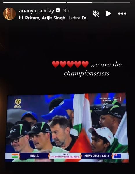 अनन्या पांडे ने इंस्टास्टोरी पर एक वीडियो शेयर करके लिखा है 'हम चैंपियंस हैं।'