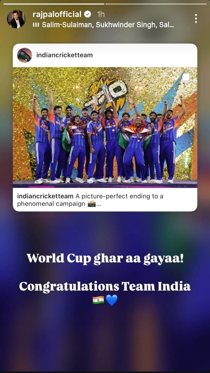 राजपाल यादव ने भारतीय टीम की तस्वीर शेयर करते हुए लिखा है 'वर्ल्ड कप घर आ गया।'