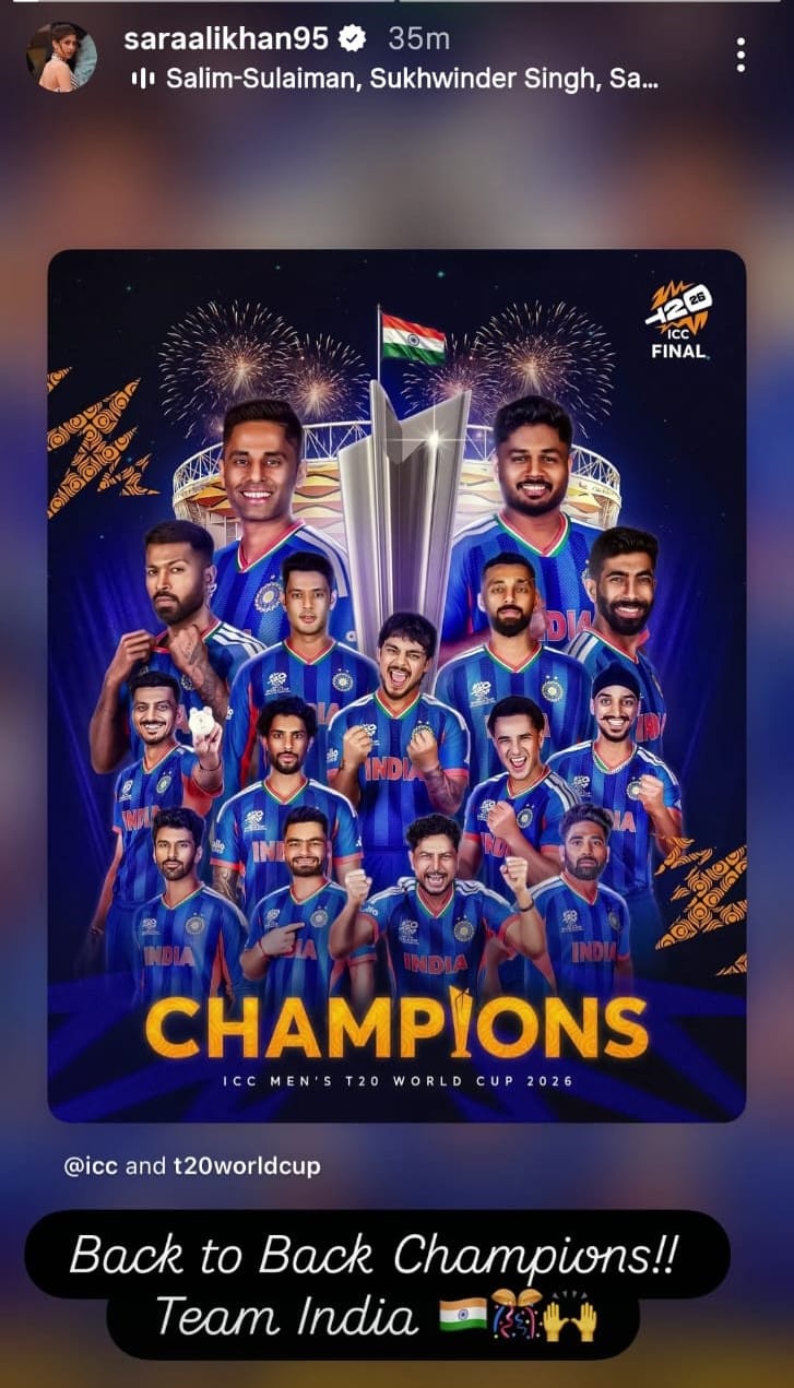 टी20 वर्ल्डकप में भारत की जीत पर सारा अली खान उत्साहित हुई हैं। उन्होंने इंस्टास्टोरी पर क्रिकेट टीम की तस्वीर लगा कर कैप्शन में लिखा है 'बार बार भारतीय टीम चैंपियन बनी है।'