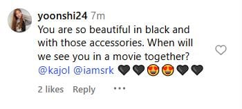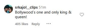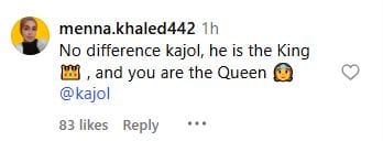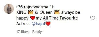 काजोल की पोस्ट पर रिएक्शन देते हुए एक यूजर ने लिखा, ‘बॉलीवुड के एक मात्र किंग और क्वीन’, एक अन्य ने लिखा, ‘कोई अंतर नहीं, काजोल - वह राजा है और आप रानी हैं।’ एक अन्य ने लिखा, किंग और क्वीन, ‘हमेशा से मेरे फेवरेट।’ आप बहुत खूबसूरत लग रही हैं ब्लैक में। हम आप दोनों को एक साथ फिल्म में कब देख रहे हैं?’ एक यूजर ने कमेंट किया, ‘आप दोनों हमेशा से मेरे लिए एक हैं।’