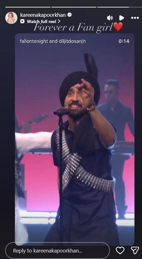 करीना कपूर खान ने दिलजीत दोसांझ के एक मशहूर अमेरिकी लेट-नाइट शो 'द टुनाइट शो स्टारिंग जिम्मी फैलन' में शामिल होने का एक क्लिप शेयर किया। इसमें उन्होंने 'मोरनी' गाना गाया। इस वीडियो को शेयर करते हुए करीना ने खुद को दिलजीत का फैन बताया है। वीडियो के साथ उन्होंने लिखा 'हमेशा एक फैन गर्ल।' इसके साथ एक लाल दिल वाला इमोजी भी लगाया है।