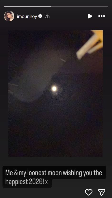 नए साल के मौके पर चांद की तस्वीर शेयर करते हुए मौनी रॉय ने लिखा है 'मैं और मेरा सबसे अकेला चांद आपको 2026 की शुभकामनाएं दे रहे हैं।'
