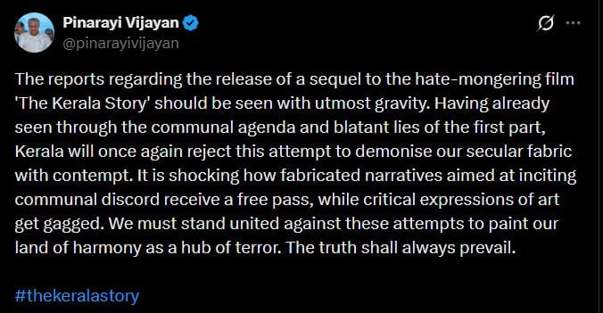 आज केरल के मुख्यमंत्री पिनाराई विजयन ने एक्स पर लोगों से इस फिल्म को रिजेक्टर करने की अपील करते हुए लिखा 'नफरत फैलाने वाली फिल्म 'द केरल स्टोरी' के सीक्वल की रिलीज की खबरों को गंभीरता से लेना चाहिए। पहले पार्ट के साम्प्रदायिक एजेंडा और खुलेआम झूठ को पहले ही देख चुका केरल एक बार फिर हमारे सेक्युलर ताने-बाने को बदनाम करने की इस कोशिश को रिजेक्ट करेगा। यह चौंकाने वाला है कि कैसे सांप्रदायिक झगड़े को भड़काने के मकसद से बनाई गई मनगढ़ंत कहानियों को खुली छूट मिल जाती है। जबकि कला के क्रिटिकल एक्सप्रेशन पर रोक लगा दी जाती है। हमें अपनी सद्भाव की जमीन को आतंक का अड्डा दिखाने की इन कोशिशों के खिलाफ एकजुट होना चाहिए। सच की हमेशा जीत होगी।'