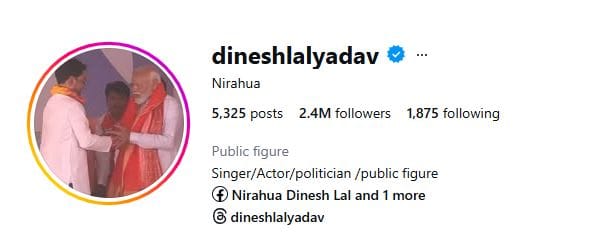 दिनेश लाल यादव को निरहुआ के नाम से भी जाना जाता है। वे एक भोजपुरी फिल्म गायक, एक्टर, सांसद लोकसभा आजमगढ़ और टेलीविजन होस्ट हैं। दिनेश लाल यादव बिग बॉस शो के कंटेस्टेंट भी रह चुके हैं। उनके इंस्टाग्राम पर 2.4 मिलियन फॉलोअर्स हैं।