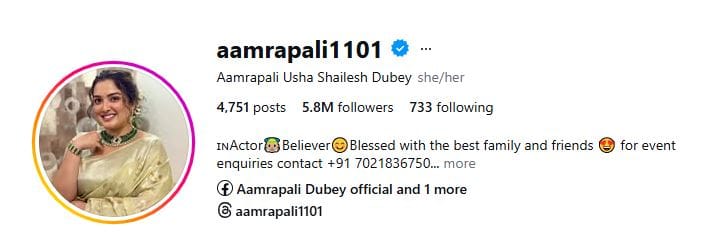 आम्रपाली दुबे एक भोजपुरी फिल्म और टेलीविजन एक्ट्रेस हैं। उन्होंने जी टीवी पर ‘सात फेरे और मायका में’ अभिनय किया था। साथ ही वे कई भोजपुरी फिल्मों में भी लीड रोल के तौर पर नजर आ चुकी हैं। आम्रपाली के इंस्टाग्राम पर 5.8 मिलियन फॉलोअर्स हैं।