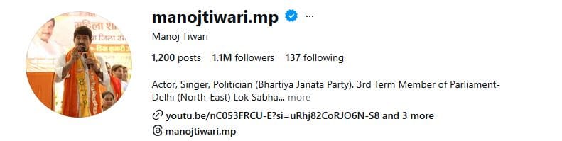 मनोज तिवारी भोजपुरी फिल्मों के सुपरस्टार और संगीत निर्देशक हैं। साथ ही फिलहाल वे राजनेता के रूप में सक्रिय हैं। बता दें कि वे 18वीं लोकसभा के सदस्य हैं। अनुराग कश्यप की फिल्म गैंग्स ऑफ वासेपुर का 'जिया हो बिहार के लाला जिया तू हजार साला' आज हर प्रोग्राम में सुनाई देता है। मनोज तिवारी काफी पॉपुलर एक्टर हैं और इंस्टाग्राम पर उनके 1.1 मिलियन फॉलोअर्स हैं।