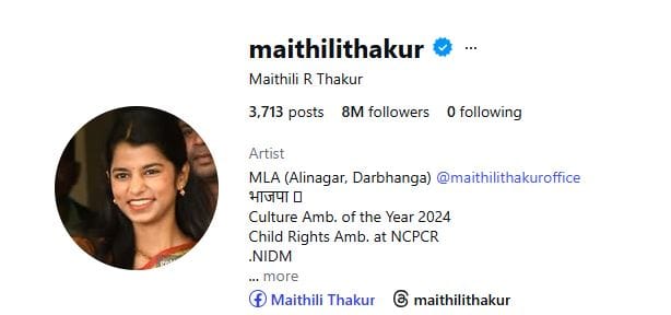 हाल ही में अनंत अंबानी के जन्मदिन पर उन्होंने अपनी आवाज से भजन संध्या की शाम सभी लोगों को मंत्रमुग्ध कर दिया था। इसके कई वीडियो सोशल मीडिया पर वायरल हुए थे। बता दें कि मैथिली के इंस्टाग्राम पर 8 मिलियन फॉलोअर्स हैं।