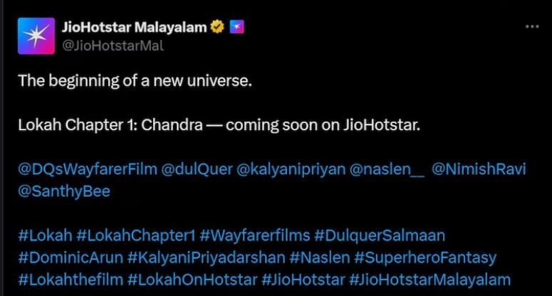 फिल्म के निर्माताओं ने आधिकारिक तौर पर एलान किया है कि 'लोका चैप्टर 1' जल्द ही जियो हॉटस्टार पर स्ट्रीम होगी। प्लेटफॉर्म ने एक पोस्ट के जरिए फैंस को इसकी जानकारी दी है। पोस्ट में लिखा है 'एक नए ब्रह्मांड की शुरुआत। लोका चैप्टर 1 जल्द आ रही है।' हालांकि अभी आधिकारिक तौर पर इसकी स्ट्रीम की तारीख का खुलासा नहीं हुआ है। रिपोर्ट्स बताती हैं कि फिल्म 17 अक्टूबर, 2025 से स्ट्रीम हो सकती है। फैंस ने सोशल मीडिया पर मांग की है कि इसे हिंदी और दूसरी भाषाओं में स्ट्रीम किया जाए।