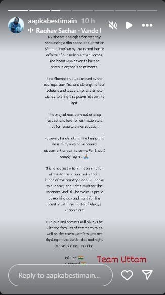 विवाद बढ़ता देख निर्देशक उत्तम महेश्वरी ने सोशल मीडिया पर एक लंबा पोस्ट लिखते हुए सार्वजनिक माफी मांगी। उन्होंने कहा कि इस फिल्म को बनाने का उद्देश्य पैसा या पॉपुलेरिटी कमाना नहीं था, बल्कि यह भारतीय सेना के साहस, बलिदान और नेतृत्व को श्रद्धांजलि देने की एक कोशिश है।