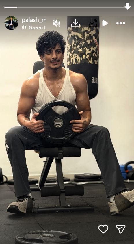 पलाश मुछाल ने अपनी इंस्टाग्राम स्टोरी पर एक फोटो शेयर की है। यह फोटो उन्होंने जिम से पोस्ट की है। इसमें पलाश वर्कआउट कर रहे हैं और पसीने से लथपथ नजर आ रहे हैं। म्यूजिक कंपोजर अपने डोले-शोले फ्लॉन्ट करते दिख रहे हैं।