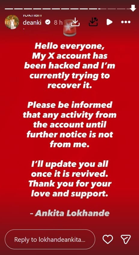 अंकिता लोखंडे ने अपनी इंस्टाग्राम स्टोरी के जरिए फैंस को यह सूचना दी है। उन्होंने लिखा है, 'सभी को नमस्कार। मेरा एक्स अकाउंट हैक हो गया है। मैं अभी उसे रिकवर करने की कोशिश कर रही हूं। कृपया ध्यान दें कि अगली सूचना तक इस अकाउंट से होने वाली कोई भी गतिविधि मेरी तरफ से नहीं है। अकाउंट के ठीक होते ही मैं आप सभी को अपडेट कर दूंगी। आपके प्यार और सहयोग के लिए शुक्रिया'।