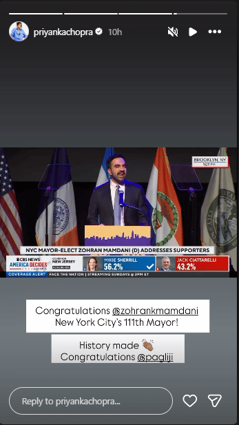 ग्लोबल आइकन प्रियंका चोपड़ा ने इंस्टाग्राम स्टोरी पर ज़ोहरान की जीत का जश्न मनाते हुए लिखा- बहुत बहुत बधाई जोहरान ममदानी जी। न्यू यॉर्क के 111वें मेयर बनने के लिए। आपने इतिहास रच दिया। बहुत बहुत शुभकामनाएं।' इस नोट में उन्होंने जोहरान की मां और प्रसिद्ध फिल्मकार मीरा नायर को भी शुभकामनाएं दीं।
