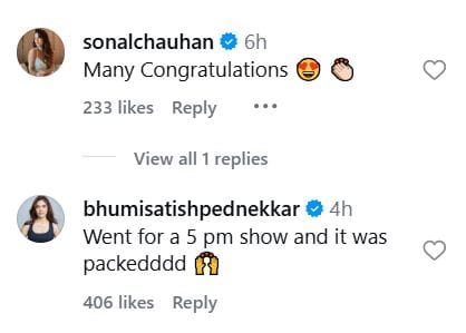 आर माधवन की इस पोस्ट पर कई सेलेब्स ने कमेंट किए हैं। अभिनेत्री सोनल चौहान ने पोस्ट पर कमेंट करते हुए लिखा 'बहुत बधाई।' अभिनेत्री भूमि पेडनेकर ने लिखा 'शाम 5 बजे का शो देखने गई थी। यह वाकई बहुत अच्छी फिल्म है।