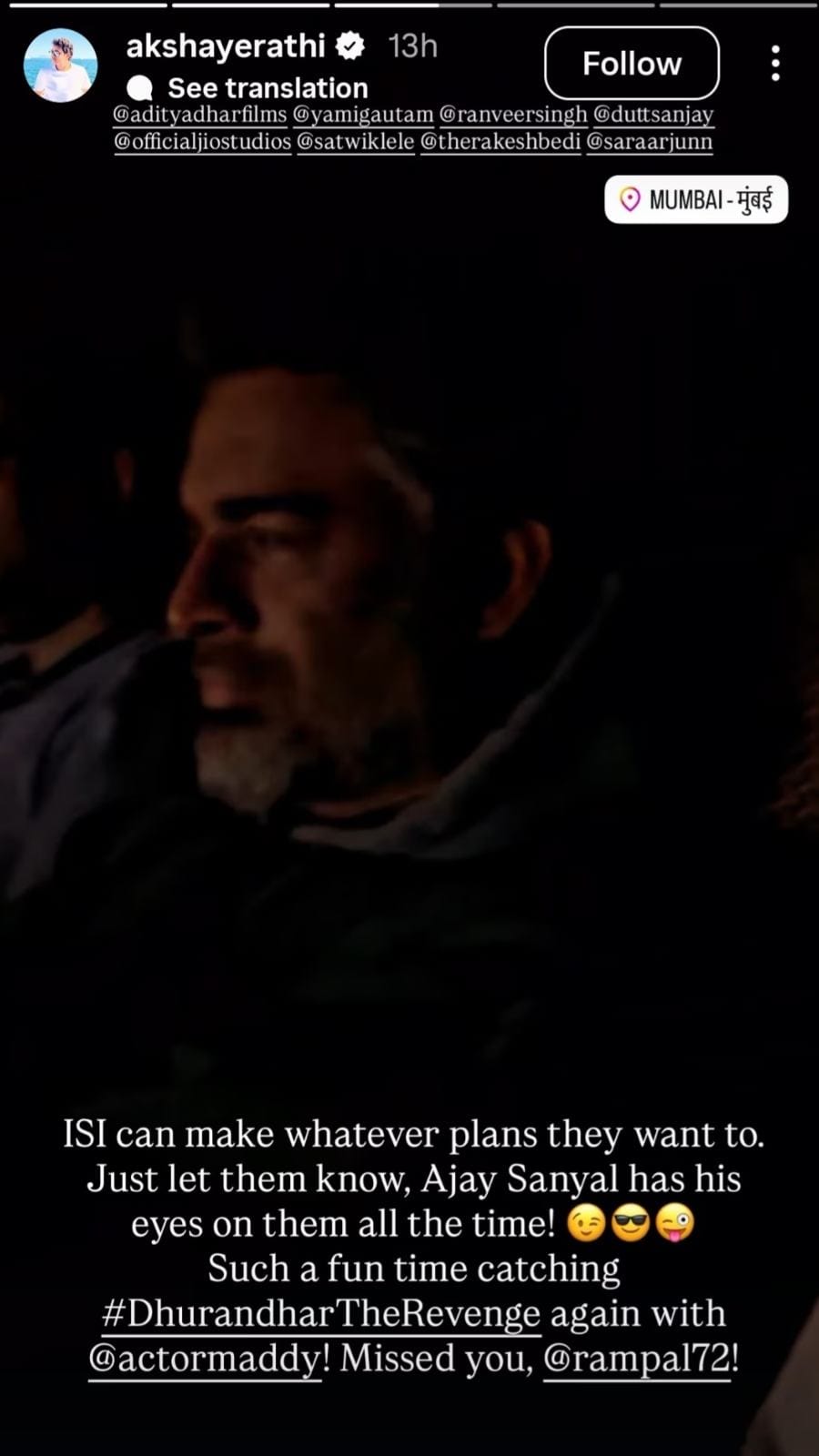 फिल्म प्रदर्शक अक्षय राठी ने आर माधवन का एक वीडियो शेयर किया, जिसके साथ उन्होंने एक मजेदार कैप्शन भी लिखा है। वीडियो में देखा जा सकता है कि आर माधवन दर्शकों के साथ फिल्म 'धुरंधर 2' देख रहे हैं। इस पोस्ट के कैप्शन में लिखा है, 'आईएसआई चाहे जो भी प्लान बना ले। बस उन्हें यह बता दो कि अजय सान्याल की नजर हर पल उन पर बनी हुई है! आर माधवन के साथ एक बार फिर 'धुरंधर 2' देखकर बहुत मजा आया।'