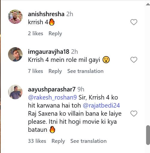 रजत बेदी की पोस्ट पर कई यूजर्स कमेंट कर रहे हैं। राकेश रोशन फिल्म 'कृष' के लिए जाने जाते हैं। अब इसके अगले पार्ट के बारे में बात हो रही है। ऐसे में फैंस ने रजत बेदी को 'कृष 4' में लेने की बात कही है। एक यूजर ने कमेंट करते हुए लिखा है 'वॉव कृष 4'। एक दूसरे यूजर ने लिखा है 'सर बंदे को कृष 4 में लेना।' एक यूजर ने दावा किया है 'अगर कृष 4 को हिट करवाना है तो रजत बेदी को विलेन के तौर पर लाइए।' इस साल राकेश रोशन ने जानकारी दी थी कि ऋतिक रोशन 'कृष 4' का निर्देशन करेंगे। हालांकि फिल्म के प्रोडक्शन के बारे उन्होंने कोई जानकारी नहीं दी थी।