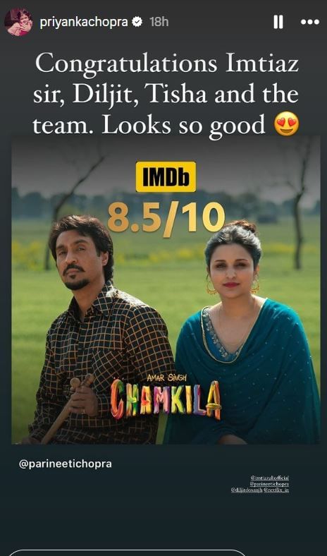 हाल ही में फिल्म को लेकर परिणीति की बहन प्रियंका चोपड़ा का रिव्यू भी सामने आया था। प्रियंका चोपड़ा ने फिल्म का पोस्टर शेयर करते हुए लिखा, ''इम्तियाज सर, दिलजीत, टीशा और टीम को बधाई। बहुत अच्छा लग रहा है।'' वहीं परिणीति ने प्रियंका की स्टोरी को रिपोस्ट किया और लिखा, ''थैंक्यू मिमी दीदी''।