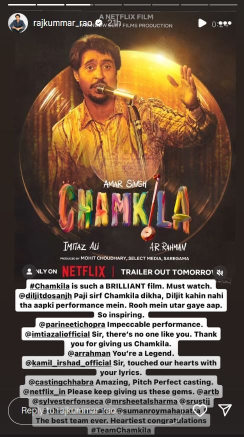 इन दिनों राजकुमार राव अपनी फिल्म 'श्रीकांत' को लेकर जमकर सुर्खियां बटोर रहे हैं। श्रीकांत अभिनेता राजकुमार राव ने फिल्म 'चमकीला' की तारीफ करते हुए अपने सोशल मीडिया अकाउंट पर एक स्टोरी साझा की है। राजकुमार ने फिल्म का पोस्टर शेयर किया और लिखा, ''चमकीला सच में एक बेहतरीन फिल्म है। जरूर देखिए।'' इसके बाद राजकुमार ने दिलजीत दोसांझ की तारीफ में लिखा, ''दिलजीत पाजी सिर्फ चमकीला दिखा, दिलजीत कहीं नहीं था आपकी परफॉर्मेंस में। रूह में उतर गए आप। बहुत प्रेरणादायक।'' इसके बाद श्रीकांत अभिनेता ने फिल्म में परिणीति चोपड़ा की तारीफ में भी दो शब्द लिखे, ''परिणीति चोपड़ा आपने बहुत ही ऊंचे दर्जे का अभिनय किया है।'' इसके बाद राजकुमार ने फिल्म के निर्देशक इम्तियाज अली की तारीफों के पुल बांध दिए। अभिनेता ने लिखा, ''सर आप जैसा कोई और नहीं है। आपका बहुत धन्यवाद चमकीला बनाने के लिए।'' इसके आगे अभिनेता ने ए आर रहमान की तारीफ करते हुए लिखा, ''ए आर रहमान आप तो लीजेंड हो।''