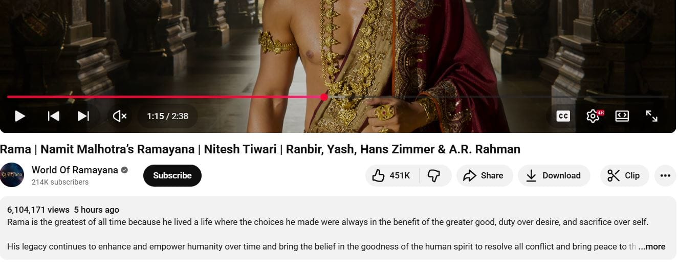 Ramayana Teaser Views: फिल्म 'रामायण' का टीजर रिलीज हो चुका है। आइए जानते हैं कि 5 घंटे में इसे कितने व्यू और कितने लाइक्स मिले हैं?