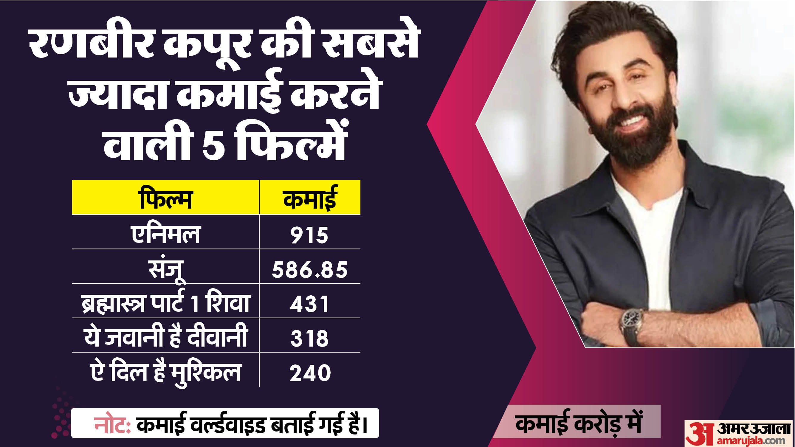 रणबीर कपूर अपने करियर में अब तक कुल 21 फिल्में बतौर अभिनेता कर चुके हैं। रणबीर ने 21 फिल्मों में 12 हिट फिल्में दी हैं। उनके करियर की सबसे ज्यादा कमाई करने वाली फिल्मों की बात करें तो इस लिस्ट में ‘एनिमल’ टॉप पर है। सैकनिल्क के मुताबिक, ‘एनिमल’ ने वर्ल्डवाइड कुल 915 करोड़ रुपए का कलेक्शन किया है। जबकि सिर्फ भारत में ‘एनिमल’ ने 553.87 करोड़ रुपए की कमाई की। इसके अलावा रणबीर की प्रमुख सफल फिल्मों में ‘अजब प्रेम की गजब कहानी’, ‘वेकअप सिड’, ‘राजनीति’, ‘रॉकस्टार’, ‘बर्फी’, ‘ये जवानी है दीवानी’, ‘ऐ दिल है मुश्किल’, ‘संजू’, ‘ब्रह्मास्त्र: पार्ट वन - शिवा’ और ‘तू झूठी मैं मक्कार’ शामिल हैं।