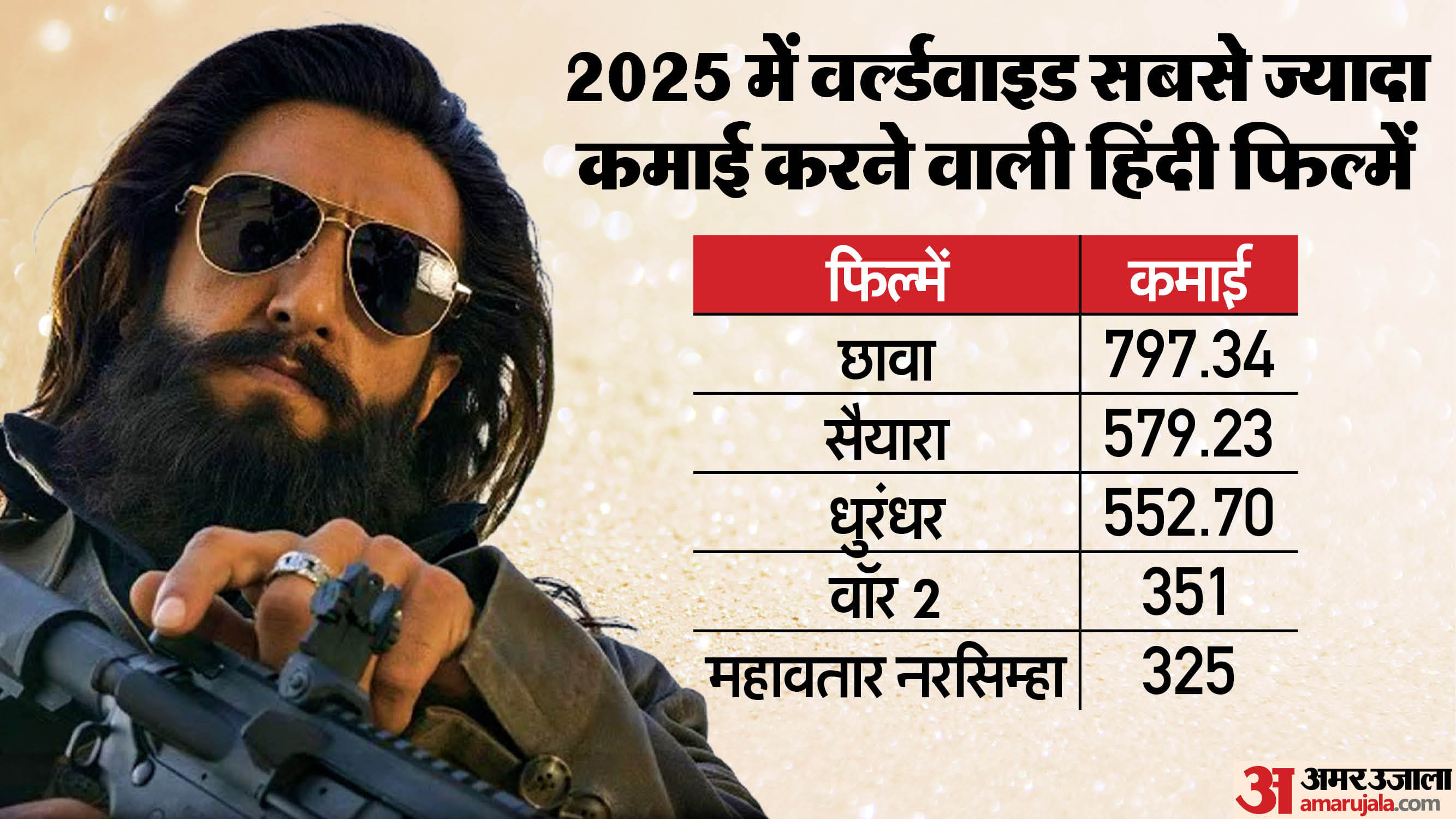 फिल्म के लगातार बढ़ते कलेक्शन की बदौलत ‘धुरंधर’ साल 2025 में सबसे ज्यादा कमाई करने वाली हिंदी फिल्मों की सूची में तीसरे नंबर पर आ गई है। वर्ल्डवाइड कलेक्शन में इस सूची में ‘धुरंधर’ से आगे अब सिर्फ ‘सैयारा’ (579.23 करोड़) और ‘छावा’ (797.34 करोड़) ही हैं। इसके बाद तीसरे नंबर पर ‘धुरंधर’ (552.70 करोड़) ही है।