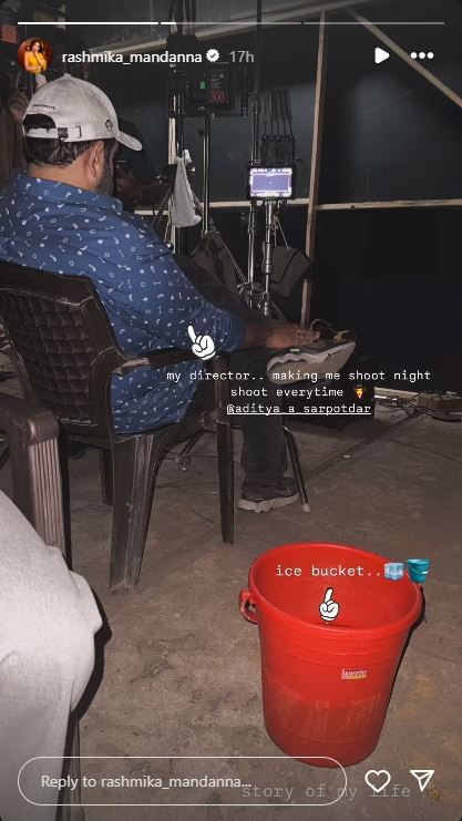 रश्मिका ने अपने इंस्टाग्राम स्टोरी पर ‘थामा’ के रात के शूट की एक तस्वीर साझा की है। साथ ही बताया है कि कैसे उनके निर्देशक उन्हें नाइट शूट करवाते हैं। रश्मिका ने स्टोरी पर फिल्म के निर्देशक आदित्य सरपोतदार की एक तस्वीर साझा की है, जिसमें वो प्लास्टिक की एक कुर्सी पर बैठे हैं और स्क्रीन को देख रहे हैं। पास में प्लास्टिक की एक बाल्टी भी रखी हुई है। स्टोरी को शेयर करते हुए रश्मिका ने लिखा, “मेरे निर्देशक मुझे हर बार नाइट शूट करवाते हैं। आइस बकेट, मेरी जिंदगी की कहानी।”