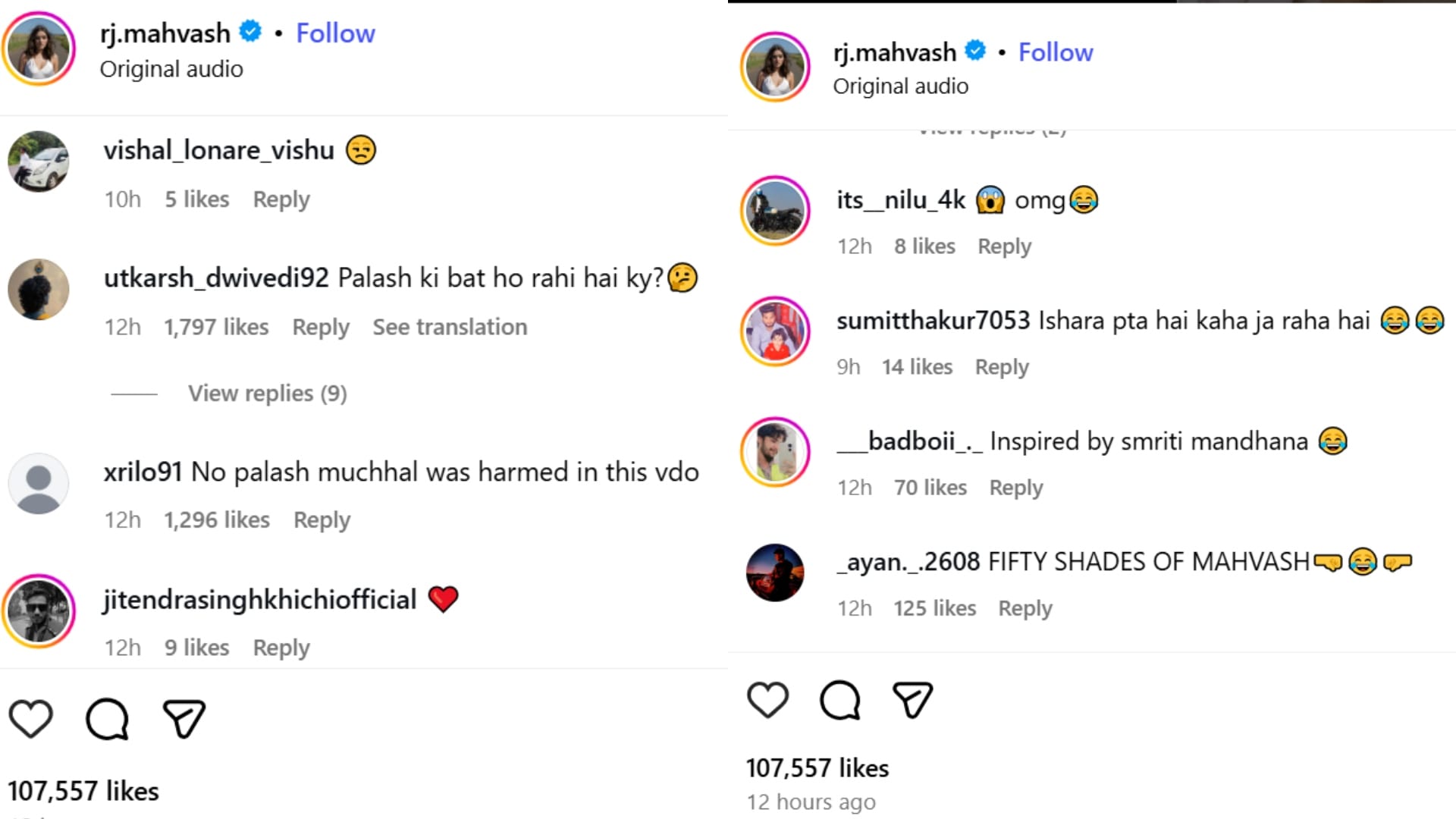 यूजर्स ने भी आरजे महवश की बातों पर रिएक्शन दिया है। एक यूजर ने लिखा, ‘पलाश की बात हो रही है क्या?’ एक अन्य यूजर ने कमेंट किया, ‘पलाश मुछाल को टारगेट नहीं किया गया है।’ एक अन्य यूजर ने कमेंट किया, ‘इशारा पता है ना कहा जा रहा है।’ एक अन्य यूजर ने लिखा, ‘स्मृति मंधाना से इंस्पायर है।’ इस तरह यूजर्स ने जता दिया कि आरजे महवश के इशारों को वह समझ गए हैं।