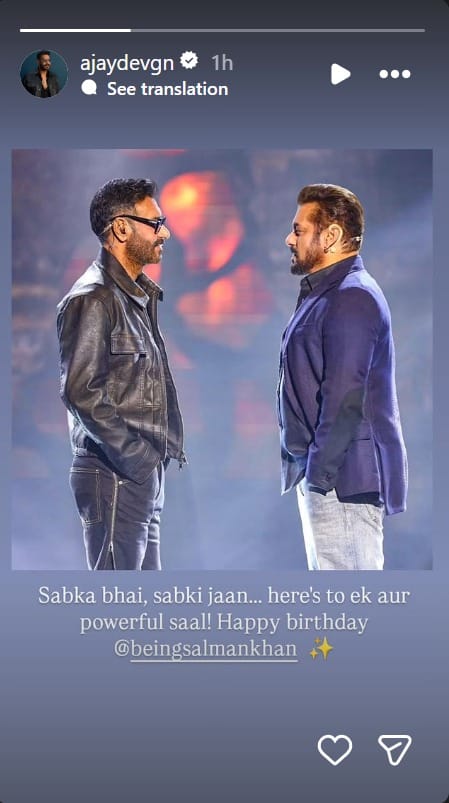 अजय देवगन ने सलमान खान के साथ एक तस्वीर शेयर की है और उन्हें भाई कहा है। उन्होंने सलमान को जन्मदिन की बधाई भी दी है।