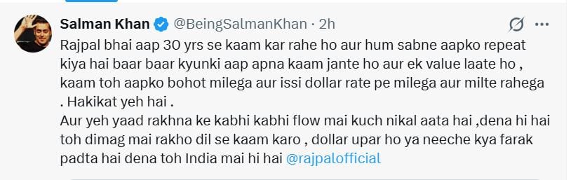 सलमान खान ने लिखा, 'राजपाल भाई, आप 30 साल से काम कर रहे हैं और हम सबने आपको बार-बार फिल्मों में इसलिए कास्ट किया है, क्योंकि आप अपना काम अच्छी तरह जानते हैं। काम तो आपको बहुत मिलेगा और इसी डॉलर रेट पर काम मिलेगा और मिलता रहेगा, ये हकीकत है। यह याद रखना कि कभी-कभी फ्लो में कुछ निकल आता है। दिल से काम करो, डॉलर ऊपर हो या नीचे, क्या फर्क पड़ता है। देना तो इंडिया में ही है।'