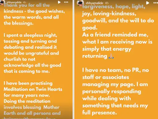 श्यामली ने लंबा-चौड़ा पोस्ट साझा करते हुए बताया कि उन्होंने पिछली रात बेचैनी में गुजारी- परेशानी, सोच-विचार और लगातार पलट-पलट कर जागती हुईं। उन्होंने कहा कि वो जीवन में मिल रहे समर्थन की उपेक्षा नहीं कर सकतीं, इसलिए सबके प्रति आभार व्यक्त करना जरूरी था। उन्होंने यह भी लिखा कि लोग जो भी प्यार और दुआएं उन्हें भेज रहे हैं, यह उसी सकारात्मक ऊर्जा की वापसी है जिसे उन्होंने वर्षों तक आध्यात्मिक अभ्यासों के माध्यम से दुनिया में भेजा है।