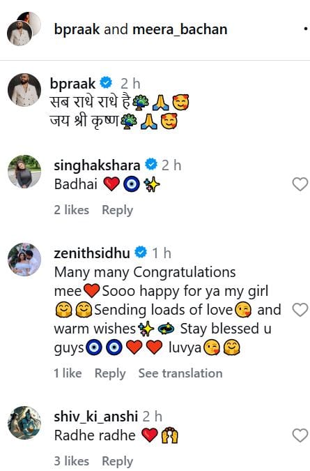बी प्राक के पोस्ट पर फैंस उन्हें बधाई दे रहे हैं। साथ ही सेलेब्स ने भी रिएक्ट करते हुए शुभकामनाएं दी हैं। भोजपुरी क्वीन अक्षरा सिंह ने लिखा है, 'बधाई'। प्राक के फैंस लिख रहे हैं, 'राधा रानी आप पर कृपा बनाए रखें'। एक अन्य यूजर ने लिखा है, 'बधाई हो। ठाकुर जी पधारे हैं'।