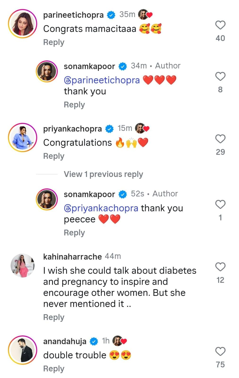 सोनम कपूर की पोस्ट पर अभिनेत्री परिणीति चोपड़ा ने कमेंट करते हुए लिखा है 'बधाई हो।' प्रियंका चोपड़ा ने लिखा 'शुभकामनाएं।' सोनम कपूर के पति आनंद आहूजा ने सोनम की पोस्ट पर कमेंट करते हुए लिखा है 'डबल ट्रबल'। करीना कपूर ने लिखा है 'सोना और आनंद।' शनाया कपूर और भूमि पेडनेकर ने पोस्ट पर दिल वाला इमोजी पोस्ट किया है।