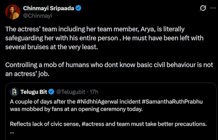 इस पूरे घटनाक्रम में सबसे ज्यादा चर्चा सामंथा के टीम मेंबर आर्या को लेकर हुई, जो भीड़ से उन्हें बचाने की कोशिश कर रहे थे। इसी को लेकर चिन्मयी श्रीपदा ने कड़ी प्रतिक्रिया दी। उन्होंने कहा कि जिस तरह आर्या अपने पूरे शरीर से सामंथा को बचा रहे थे, उससे साफ है कि उन्हें भी चोटें आई होंगी।