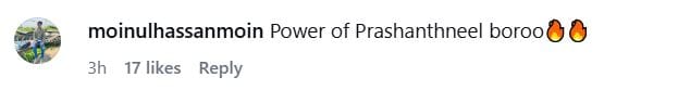 तस्वीर में जूनियर एनटीआर की गठीली बॉडी देखकर फैंस हैरान हो गए। वे एनटीआर के समर्पण और जुनून की जमकर तारीफ कर रहे हैं। पोस्ट पर कमेंट करते हुए एक यूजर ने लिखा है 'टाइगर'। एक और यूजर ने लिखा 'ड्रैगन'। एक और यूजर ने लिखा 'जय एनटीआर'। एक और यूजर ने लिखा है 'प्रशांत नील की ताकत'।