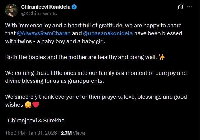 आपको बता दें कि राम रचण के पिता चिरंजीवी ने सबसे पहले उनके माता पिता बनने पर पोस्ट की थी। उन्होंने लिखा 'बहुत खुशी के साथ हम आपको यह बता रहे हैं कि राम चरण और उपासना को जुड़वां बच्चे हुए हैं, एक लड़का और एक लड़की। बच्चे और मां दोनों स्वस्थ हैं। इन नन्हे-मुन्नों का स्वागत करना और दादा-दादी बनने का सौभाग्य, हमारे लिए ईश्वर का आशीर्वाद है। आप सबकी प्रार्थना, प्यार, आशीर्वाद और शुभकामनाओं के लिए दिल से धन्यवाद।'