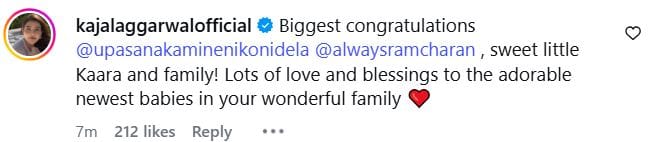 अभिनेत्री काजल अग्रवाल ने राम चरण और उपासना को जुड़वा बच्चों के स्वागत करने पर बधाई दी है। उन्होंने राम चरण की पोस्ट पर कमेंट करते हुए लिखा 'उपासना और राम चरण, आप लोगों के नए बच्चों को बहुत सारा प्यार और उनके लिए दुआएं।'