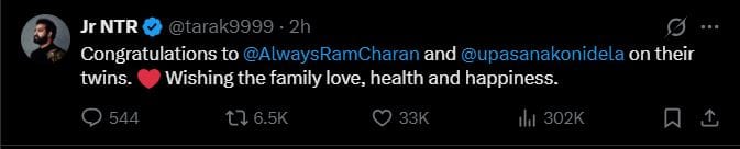 अभिनेता जूनियर एनटीआर ने एक्स पर राम चरण और उनकी पत्नी को बधाई दी है। उन्होंने लिखा 'राम चरण और उपासना के यहां जुड़वा बच्चे होने की शुभकामनाएं। आपका प्यार बना रहे। आप खुश और स्वस्थ रहें।'