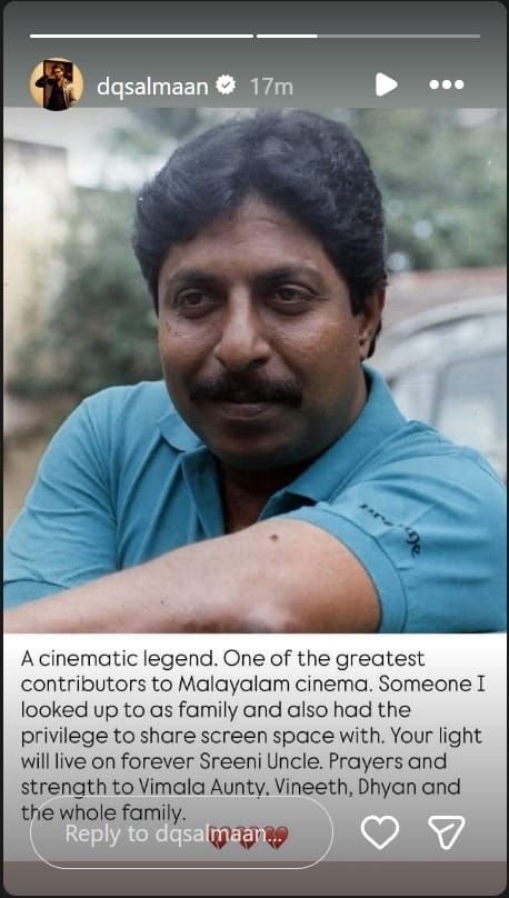 मलयालम सिनेमा जगत के कई एक्टर्स अभिनेता श्रीनिवासन के निधन पर दुखी हैं। सोशल मीडिया के जरिए दुलकर सलमाल, पृथ्वीराज सुकुमारन और टोविनो थॉमस ने दिग्गज कलाकार श्रीनिवासन को याद किया। इनके अलावा एक्टर और राइटर रेन्जी पणिक्कर ने भी श्रीनिवासन को श्रद्धांजलि दी है।