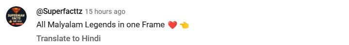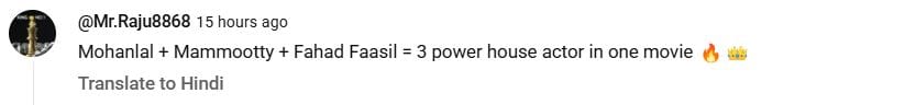 'पैट्रियट' का हिंदी ट्रेलर देखकर कई यूजर्स ने इस पर कमेंट किए हैं। एक यूजर ने लिखा है 'ममूटी, मोहनलाल और नयतारा। एक ही फिल्म में तीन पावर हाउस।' एक दूसरे यूजर ने लिखा है 'ममूटी पद्म भूषण पुरस्कार विजेता 2026, मोहनलाल दादासाहेब फाल्के पुरस्कार विजेता 2025'। एक और यूजर ने लिखा 'एक ही फ्रेम में सभी मलयालम लीजेंड।'