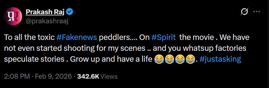 बता दें कि ऐसी अफवाहें चल रही थीं कि प्रकाश राज और फिल्म 'स्पिरिट' के निर्देशक संदीप रेड्डी वांगा के बीच कुछ क्रिएटिव मतभेद हो गए हैं। इसके बाद प्रकाश राज ने फिल्म से हाथ खींच लिए हैं और उनकी जगह कोई दूसरा कलाकार खोजा जा रहा है। मगर, इस किस्म की अफवाहों को प्रकाश राज ने सोशल मीडिया पोस्ट के जरिए खारिज कर दिया है। साथ ही साफ कर दिया कि वे फिल्म का हिस्सा हैं।